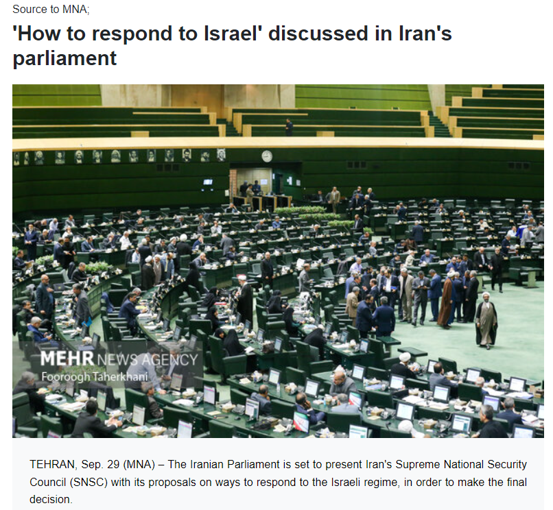 Парламент Ирана согласует варианты "ответа и мести" Израилю за убийство лидера ливанского движения "Хезболла" Хасана Насраллы и предложит их Высшему совету национальной безопасности, который решит, как действовать.