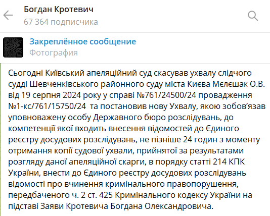 Далее Кротевич подал жалобу на ГБР в Шевченковский райсуд Киева, но тот отказался удовлетворить жалобу за то, что ведомство по его заявлению не завело дело против экс-командующего Объединенными силами ВСУ Юрия Содоля.