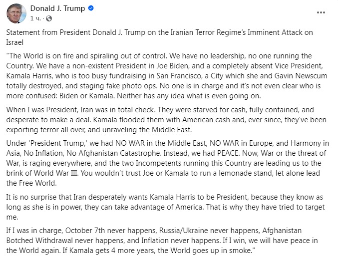 "Они жаждали денег, полностью подавляемы и отчаянно хотели заключить сделку. Камала завалила их американскими деньгами, и с тех пор они экспортируют террор по всему миру и разваливают Ближний Восток. При президенте Трампе у нас не было войны на Ближнем Востоке, не было войны в Европе и была гармония в Азии, никакой инфляции, никакой афганской катастрофы. Вместо этого у нас был мир. Теперь война или угроза войны бушует повсюду, и два некомпетентных человека, управляющих этой страной, ведут нас к грани третьей мировой войны", - считает Трамп.