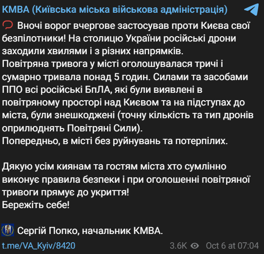 "Силами и средствами ПВО все российские БПЛА, обнаруженные в воздушном пространстве над Киевом и на подступах к городу, были обезврежены (точное количество и тип дронов обнародуют Воздушные Силы).