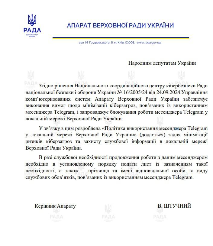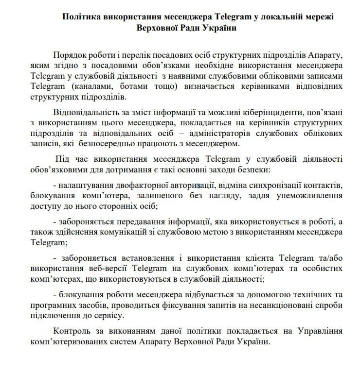 Чиновникам Аппарата Верховной Рады запретили устанавливать и использовать Телеграм на личных компьютерах