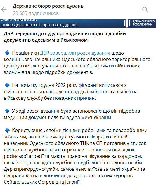 Государственное бюро расследований (ГБР) передало в суд дело о поездке экс-главы Одесского ТЦК Евгения Борисова на Сейшелы под видом раненого на фронте.