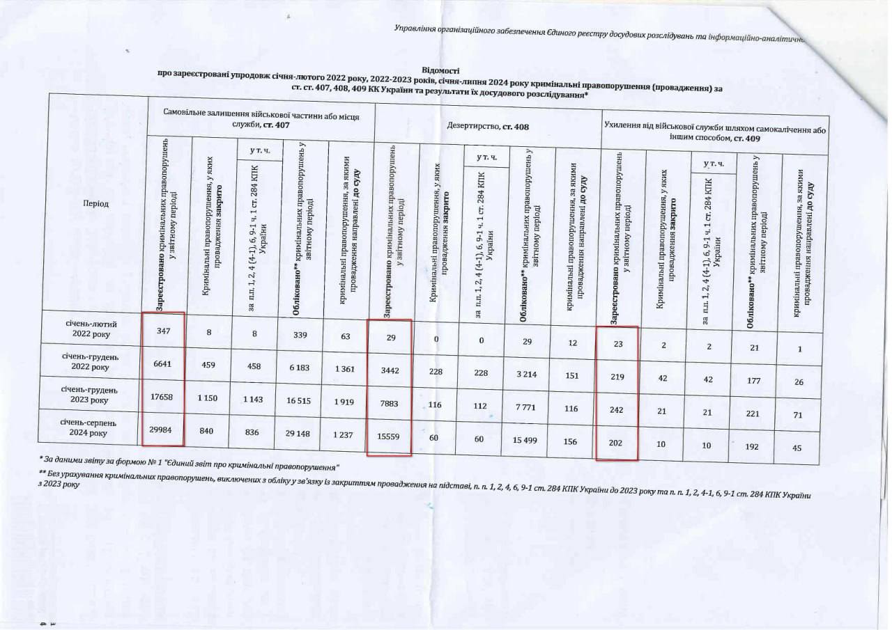 Как говорится в ответе Офиса генпрокурора на запрос "Общественного совета добропорядочности", за восемь месяцев текущего года открыто 29 984 производства за самовольное оставление части и 15 559 за дезертирство. В первый год войны таких случаев было соответственно 6641 и 3442. То есть рост по обоим показателям примерно пятикратный.