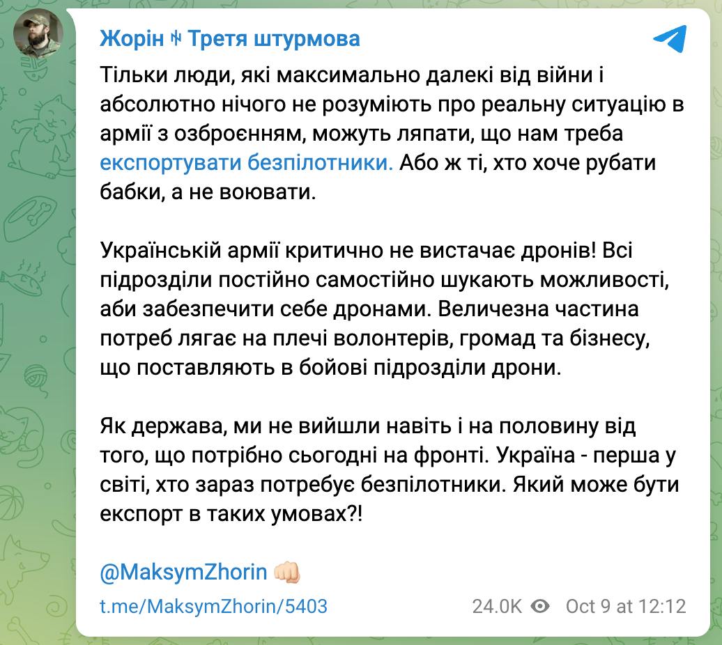 "Украинской армии критически не хватает дронов! Все подразделения постоянно самостоятельно ищут возможности, чтобы обеспечить себя дронами. Большая часть потребностей ложится на плечи волонтеров, общин и бизнеса, поставляющих в боевые подразделения дроны. Как государство мы не вышли даже и на половину от того, что нужно сегодня на фронте. Какой может быть экспорт в таких условиях?" - написал Жорин в своем телеграм-канале.