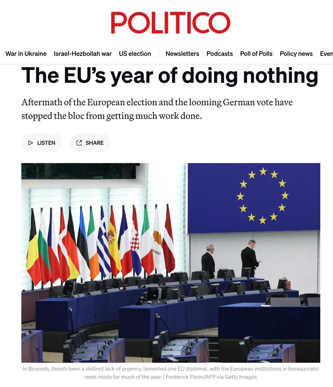 Издание напоминает, что подобный паралич был у ЕС в первой половине 2024 года из-за выборов в Европарламент. Большую часть года институты ЕС находились в "режиме бюрократической перезагрузки".