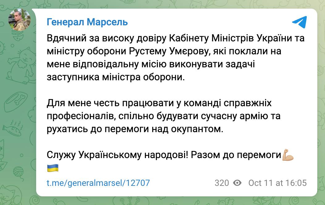 Он благодарит Умерова и Кабмин за доверие, пишет о планах "совместно строить современную армию и двигаться к победе".