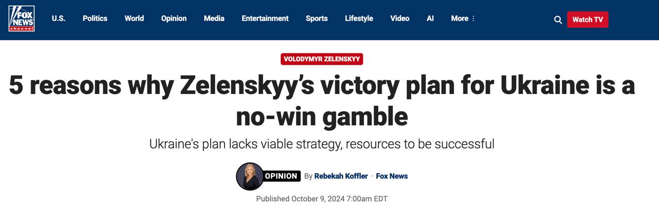 2. "План Зеленского игнорирует реальность на земле. Россия постепенно, но уверенно продвигается на поле боя". Украина подвергается ракетным атакам, которые уничтожают её энергетику. "Изменение текущей ситуации - монументальная задача, которую Украина не в состоянии выполнить". Дальнобойные удары по РФ этого не изменят.