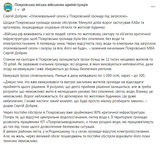 "Войска РФ выживают из города людей, бьют по жилому сектору и объектам критической инфраструктуры, чтобы Покровская община была без отопления, без воды и электроснабжения. А впереди зима. Из-за отсутствия газа, воды и электричества под угрозой отопительный сезон и скорее всего, его не будет", -  сказал Добряк.
