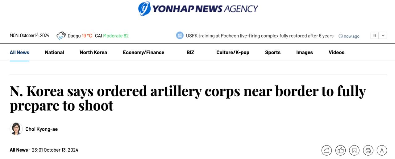 Сестра Ким Чен Ына заявляет, что артиллерийским корпусам КНДР около границы отдан приказ полностью подготовиться к стрельбе, и Пхеньян готов предпринять "решительные ответные действия" в случае, если беспилотники снова будут запущены.