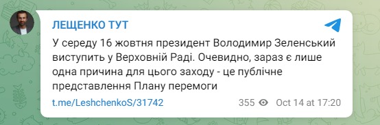 "В среду, 16 октября, президент Владимир Зеленский выступит в Верховной Раде. Очевидно, сейчас только одна причина для этого мероприятия: это публичное представление "плана победы", - написал Лещенко в своем телеграм-канале.