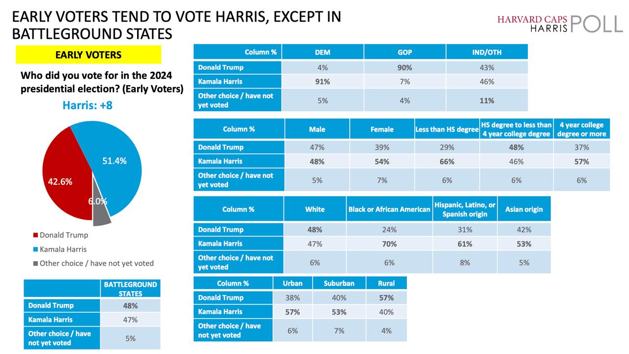Харрис же пока опережает Трампа на 8% среди досрочно проголосовавших по всем штатам - 51% против 43%.