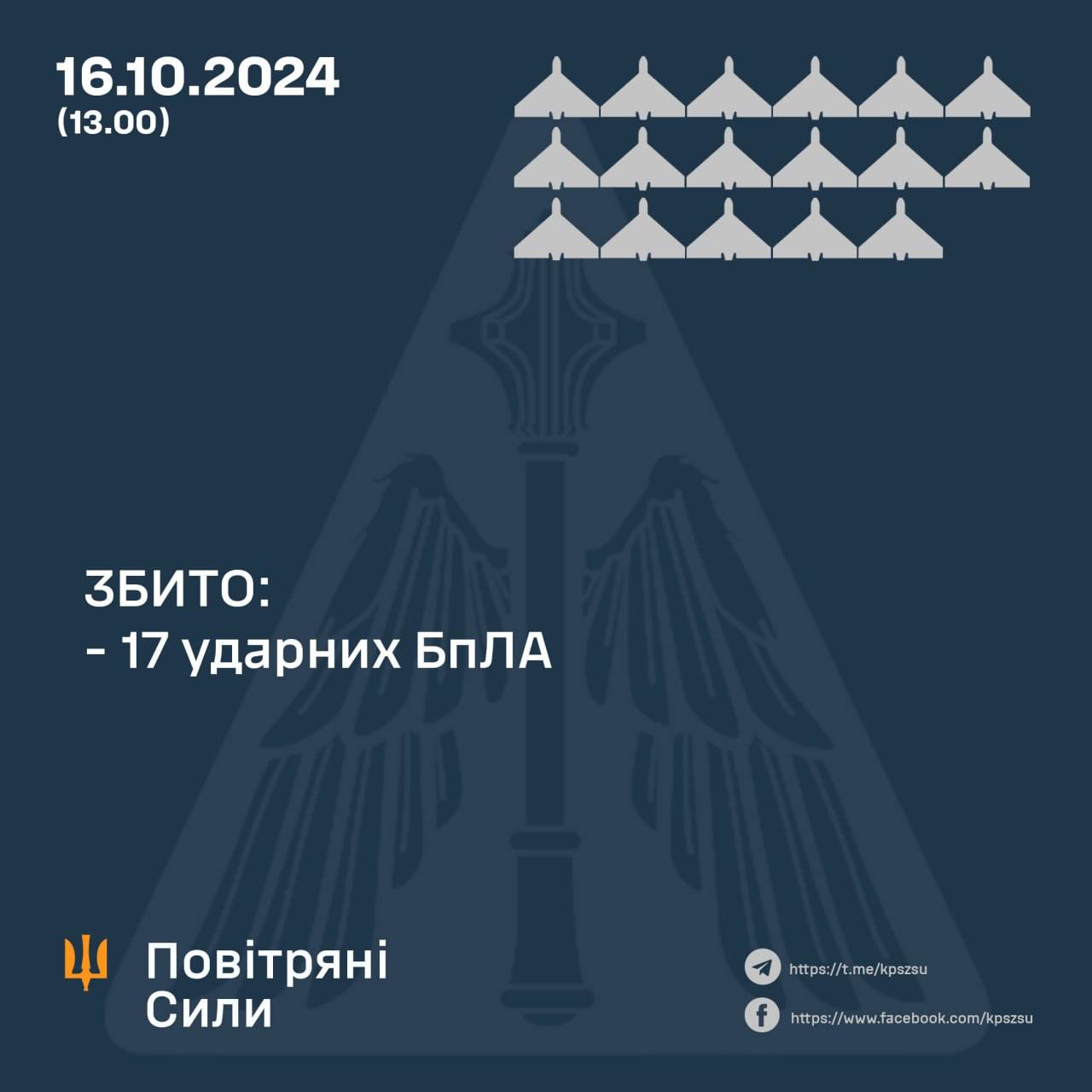14.40 Воздушные силы сообщают, что днем сбили еще 17 "Шахедов".