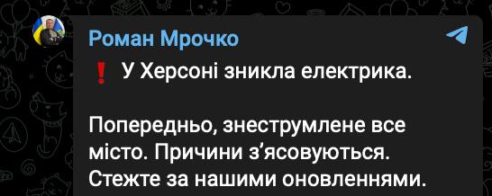 8.33 Власти Херсона подтвердили, что весь город обесточен. Причина выясняется.