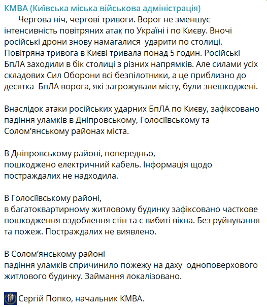 В результате атаки "Шахедов" по Киеву зафиксировано падение обломков в Днепровском, Голосеевском и Соломенском районах города.