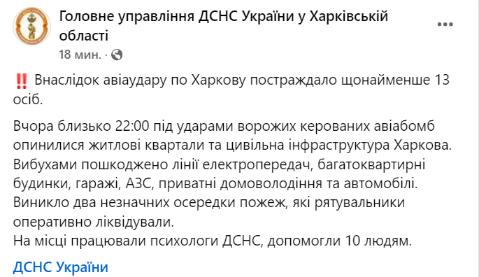 Вчера поздно вечером россияне ударили КАБами по жилым кварталам и гражданской инфраструктуре Харькова. Пострадали не менее 13 человек, среди них ребенок.