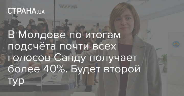 В Молдове по итогам подсчёта почти 98% голосов у действующего президента Майи Санду 41,83%, у ее ближайшего конкурента кандидата от пророссийской Партии социалистов Александра Стояногло - 26,36%.
