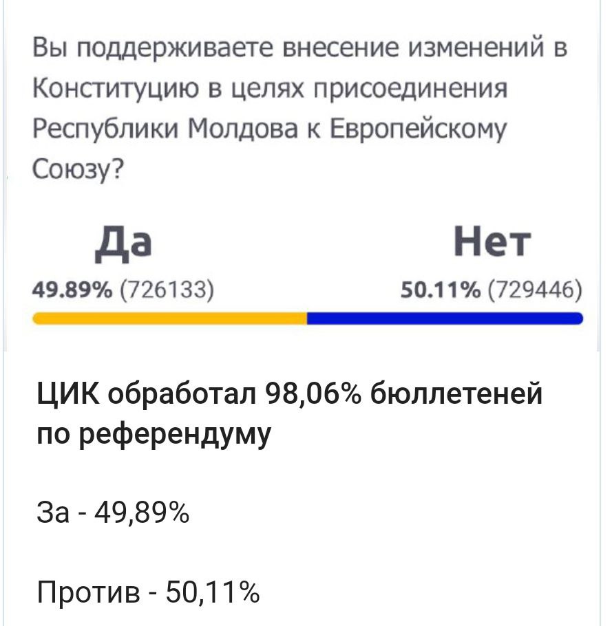 Обработано более 98% протоколов. И на данный момент соотношение остаётся прежним: за включение европейского вектора в Конституцию проголосовали 49,89% избирателей, а против - 50,11%.