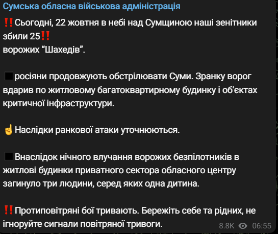 07:38 Утром "Шахеды" ударили по многоквартирному дому в Сумах и объектам критической инфраструктуры.