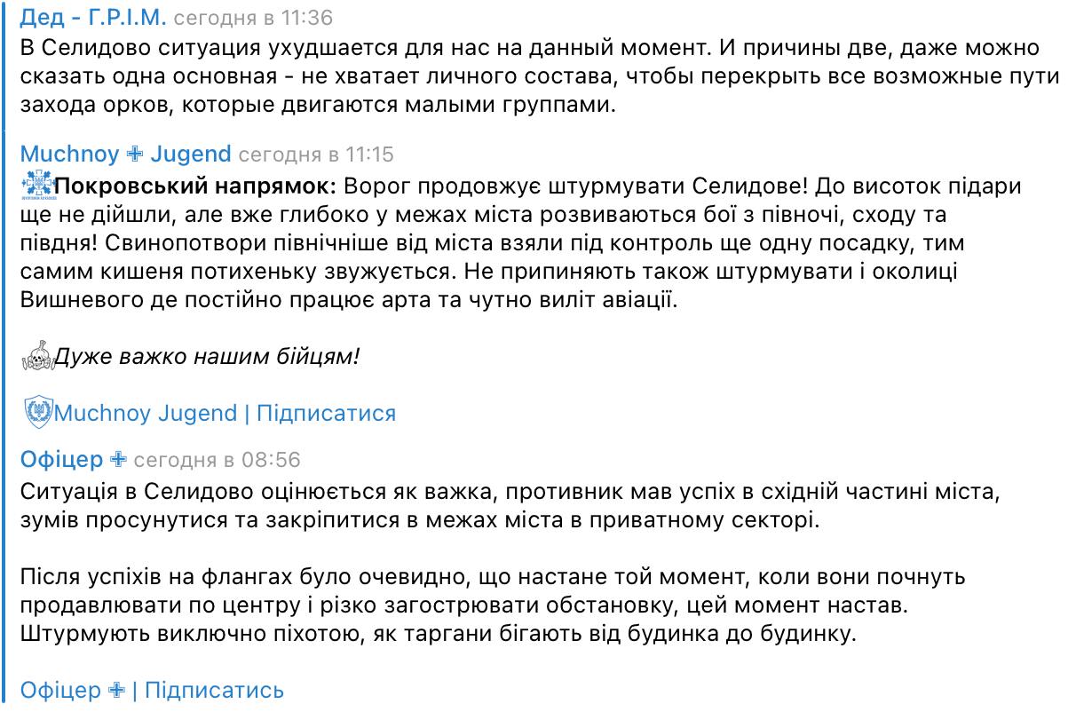 12:19 Украинские военные пишут об ухудшении ситуации в Селидово, где уже идут городские бои и осталась только одна дорога снабжения.