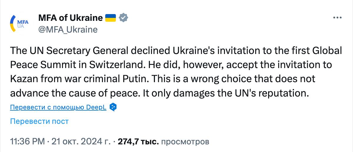 "Генеральный секретарь ООН отклонил приглашение Украины на первый Глобальный саммит мира в Швейцарии. Однако он принял приглашение в Казань от военного преступника Путина. Это неправильный выбор, который не способствует делу мира. Он только вредит репутации ООН", - говорится в сообщении.