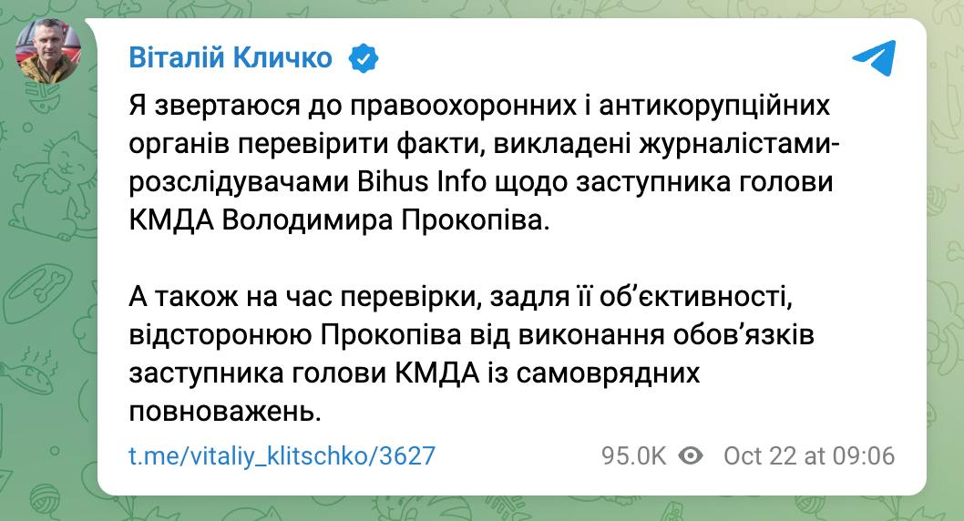 Мэр Киева Виталий Кличко отстранил от исполнения обязанностей своего заместителя Владимира Прокопива после публикации журналистского расследования о его активах.