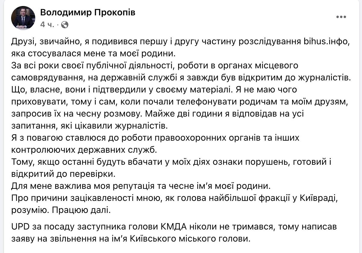 По данным Bihus Info, с 2015 года, когда Прокопив стал секретарем Киевсовета, а позже и заместителем мэра Кличко, его семья стала активно покупать различные активы: тесть и супруга скупали квартиры и офисные помещения в Киеве, теща купила дом в области.