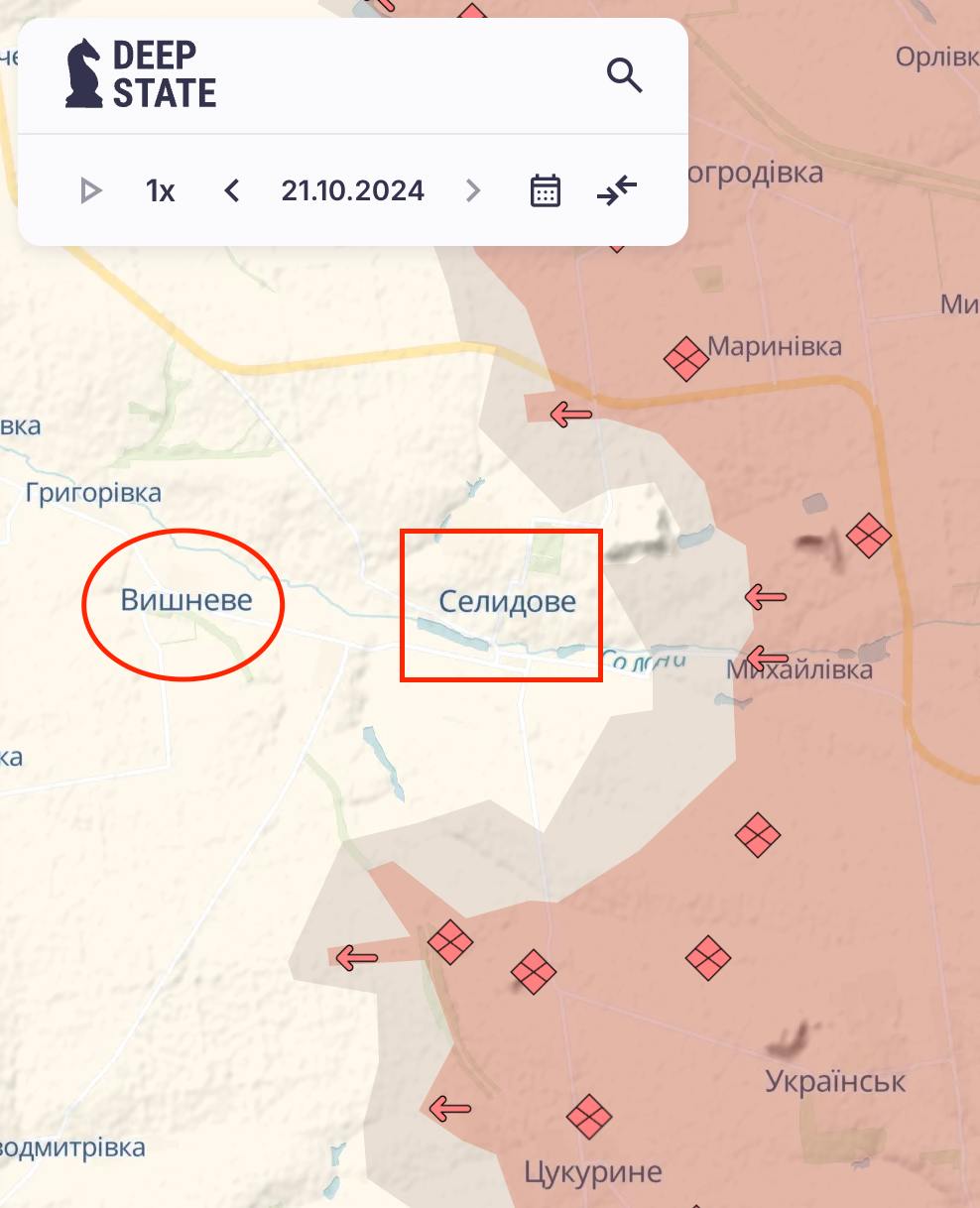 Также "Мучной" подтверждает данные российских пабликов, что уже идут штурмы Вишнёвого к западу от Селидово, чтобы отрезать город от Покровска. Карта Deep State пока даёт картину по состоянию на вчера и не отображает этих данных.