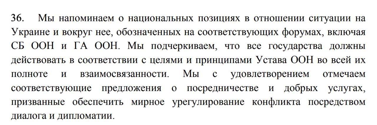 "Мы напоминаем о национальных позициях в отношении ситуации в Украине и вокруг нее, обозначенных на соответствующих форумах, включая СБ ООН и ГА ООН. Мы подчеркиваем, что все государства должны действовать в соответствии с целями и принципами Устава ООН во всей их полноте и взаимосвязанности. Мы с удовлетворением отмечаем соответствующие предложения о посредничестве и добрых услугах, призванные обеспечить мирное урегулирование конфликта посредством диалога и дипломатии", - говорится в сообщении.