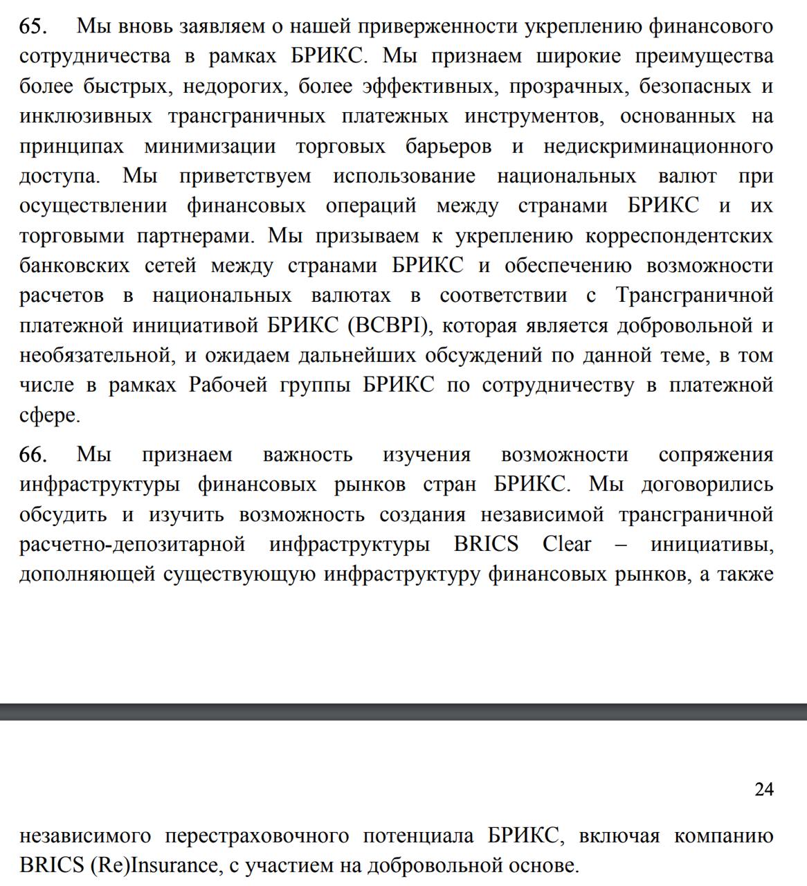 "Мы признаем важность изучения возможности сопряжения инфраструктуры финансовых рынков стран БРИКС. Мы договорились обсудить и изучить возможность создания независимой трансграничной расчетно-депозитарной инфраструктуры BRICS Clear – инициативы, дополняющей существующую инфраструктуру финансовых рынков, а также независимого перестраховочного потенциала БРИКС, включая компанию BRICS (Re)Insurance, с участием на добровольной основе", - говорится в декларации.