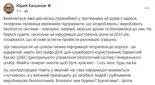 "Эта тайная информация попала к врагу из открытого, даже без грифа ДСП (для служебного пользования), красочного буклета Центрального управления беспилотных систем Генерального штаба", – рассказал Касьянов.