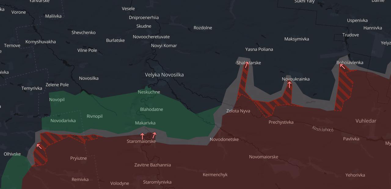 08:40 За минувшие сутки россияне закрепились в Шахтерском, куда продвинулись накануне. Далее они атаковали чуть восточнее - село Новоукраинка, продвинувшись почти на четыре километра.