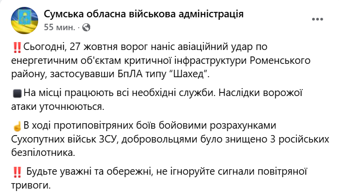 08:00 Сегодня ночью россияне ударили по энергетическим объектам критической инфраструктуры Роменского района Сумской области, применив БПЛА типа "Шахед".