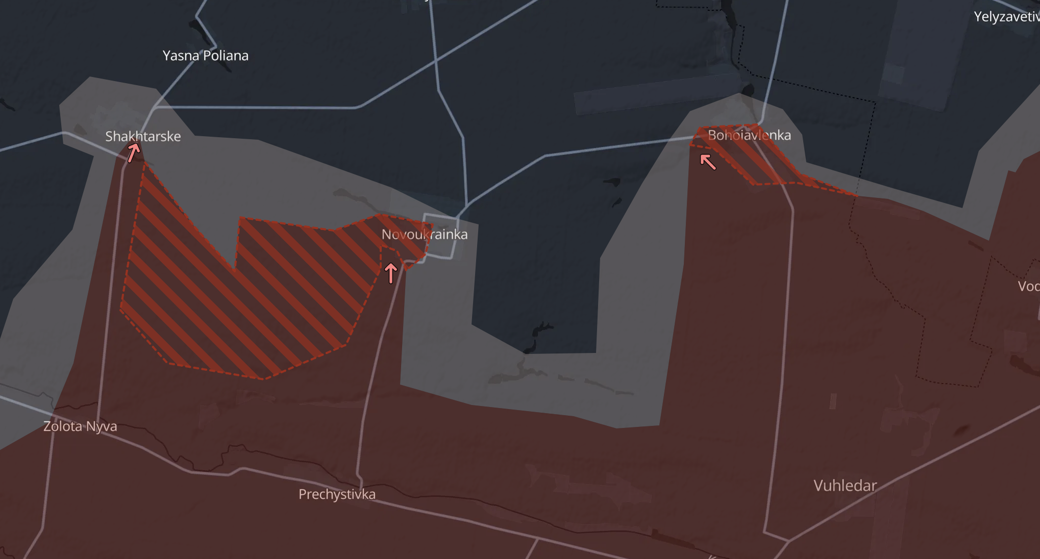 Также DS подтвердил захват почти всей Богоявленки (к северу от Угледара). Небольшая часть села, по версии паблика, находится в серой зоне. Кроме того, россияне выровняли фланги в районе Шахтерского и Новоукраинки на Южнодонбасском фронте. Z-паблики утверждают, что эти населенные пункты, включая Богоявленку, захвачены. Также они говорят, что от Шахтерского армия РФ наступает далее на север к Ясной Поляне.