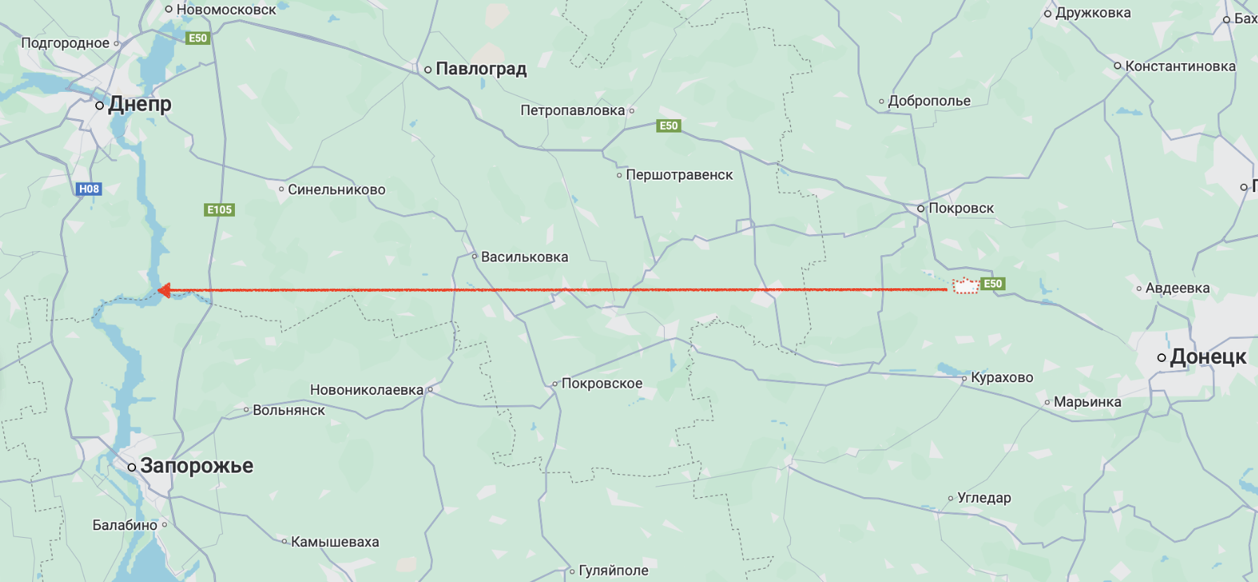 Если провести прямую линию от Селидово к реке Днепр, то там не будет ни одного крупного города. И неизвестно, есть ли там вообще серьёзные укрепления. Это стык Днепропетровской и Запорожской областей, и к реке Днепр эта линия подходит к северу от Запорожья и к югу от города Днепр (примерно на полпути между ними).