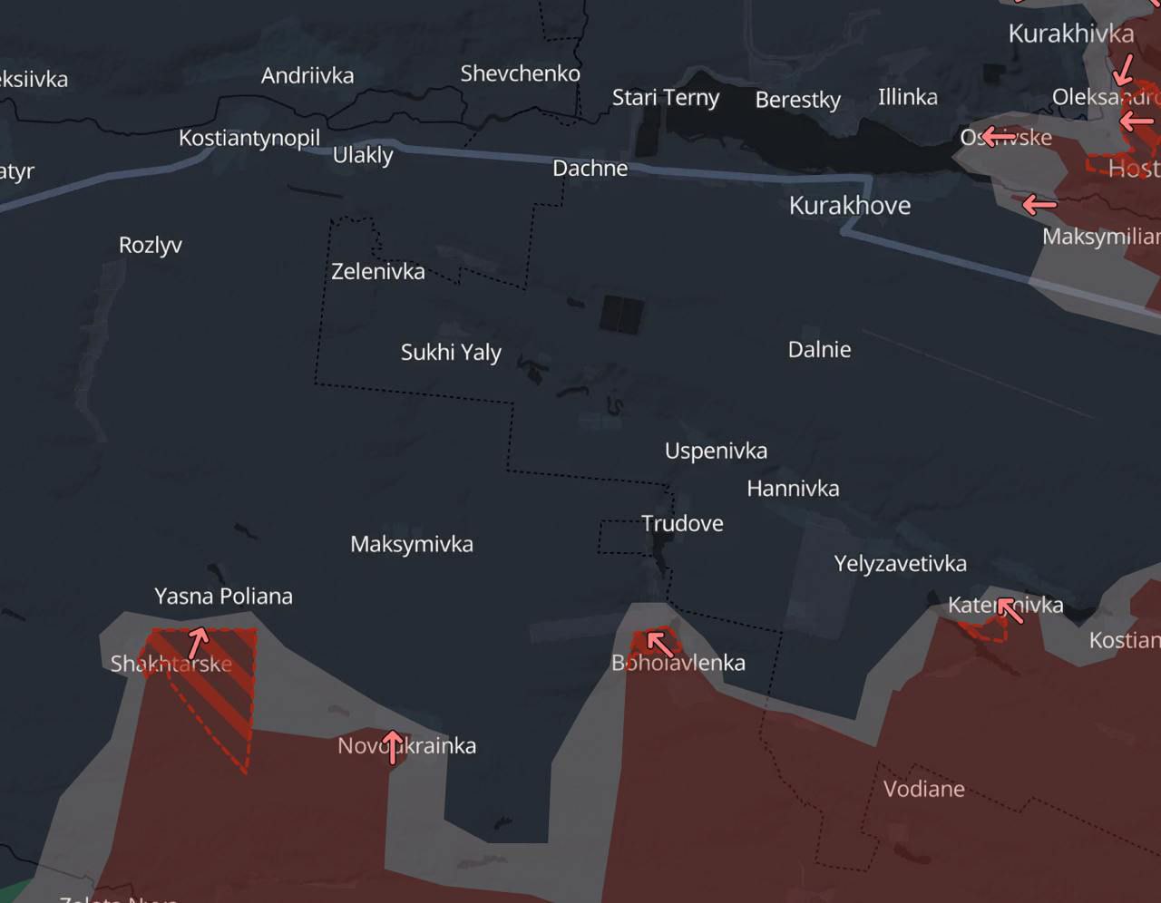 Ранее сообщалось, что российские войска продвинулись в трех местах к югу от Курахово -у Ясной Поляны, Богоявленки и Екатериновки. Севернее Курахово российские войск продвинулась в Новоселидовке.