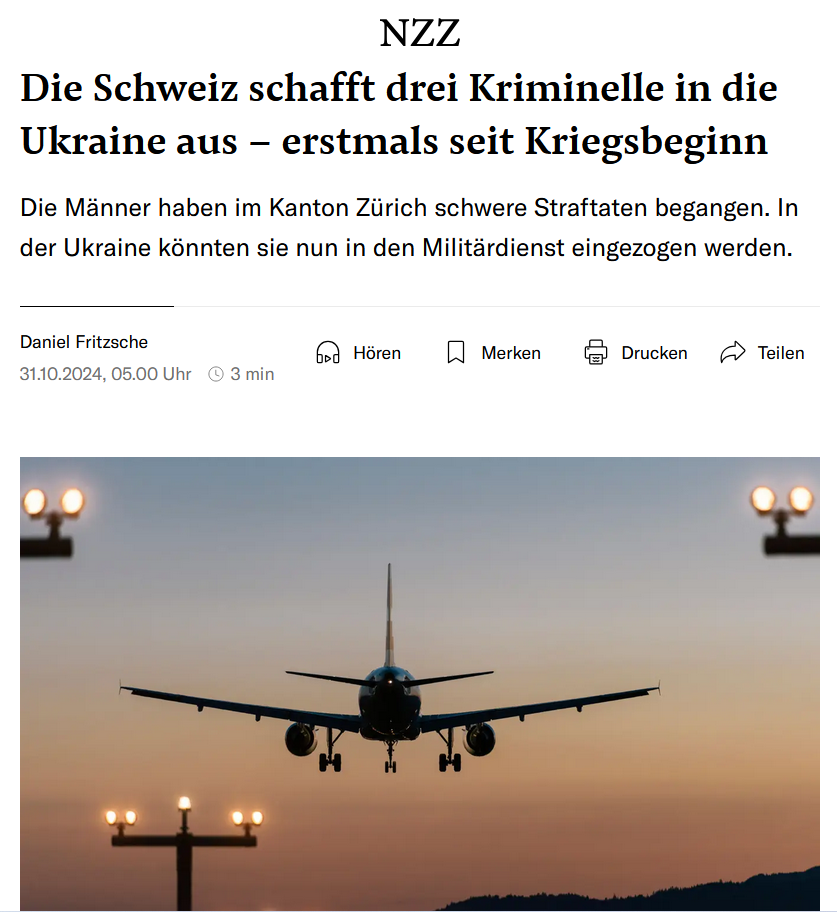 Отмечается, что три человека были высланы в Украину специальным рейсом из Цюриха. Газета пишет, что высылка осуществлялась через Польшу, откуда преступники должны были быть доставлены на территорию Украины наземным транспортом. Это первая высылка украинцев с начала российского вторжения.