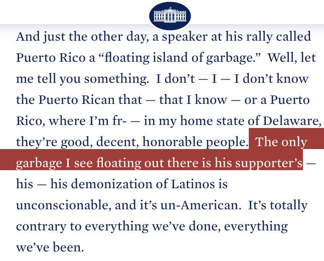 После появления видео, где Байден говорит, что "единственный мусор, который я вижу, это его [Трампа] сторонники", на сайте Белого дома вышла расшифровка речи.