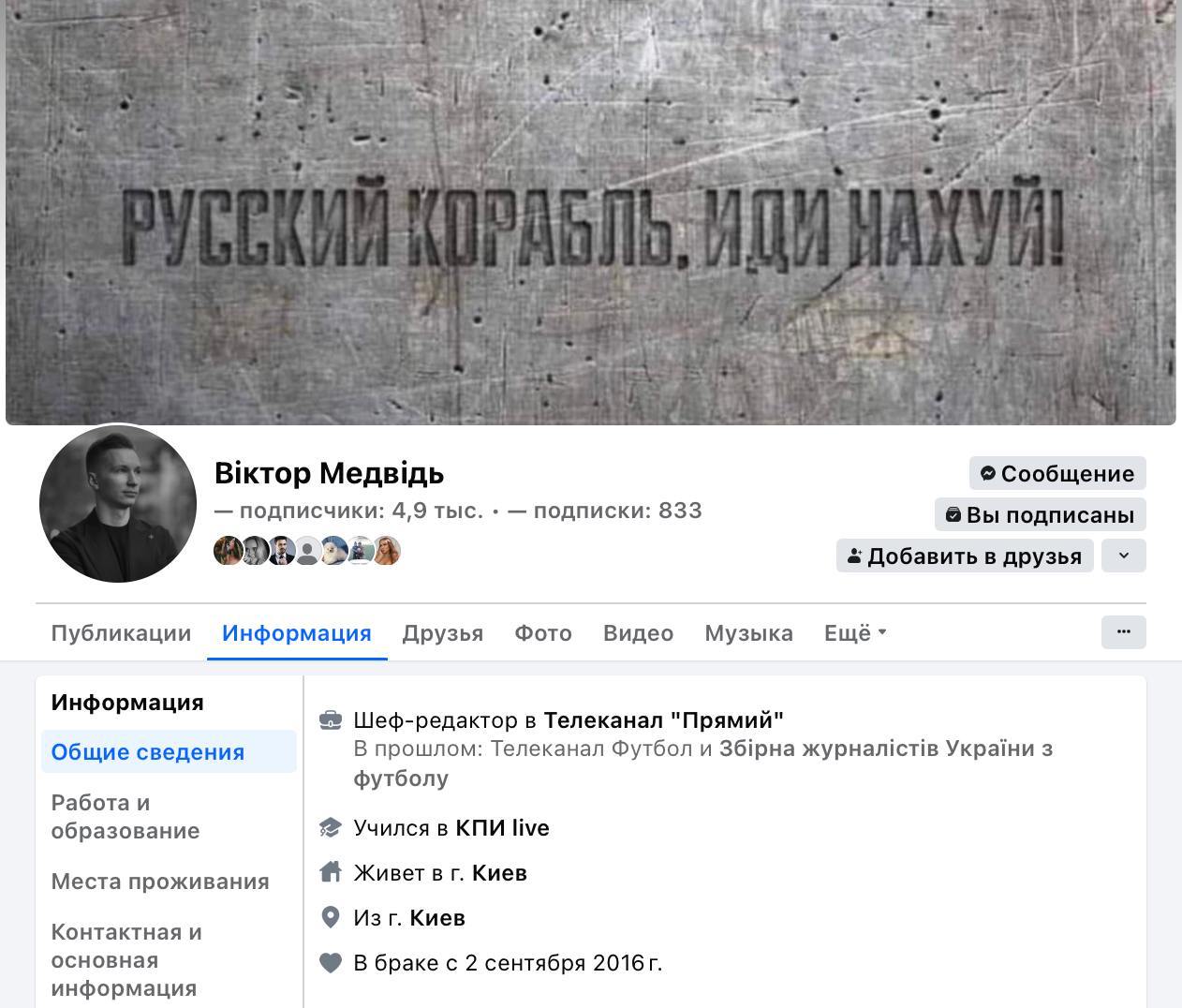 В публикации указано не полное имя журналиста - Виктор М. СМИ предполагают, что речь идет о Медведе, который с 2019 года работает шеф-редактором телеканала "Прямой". Сам он этой информации не подтверждал.