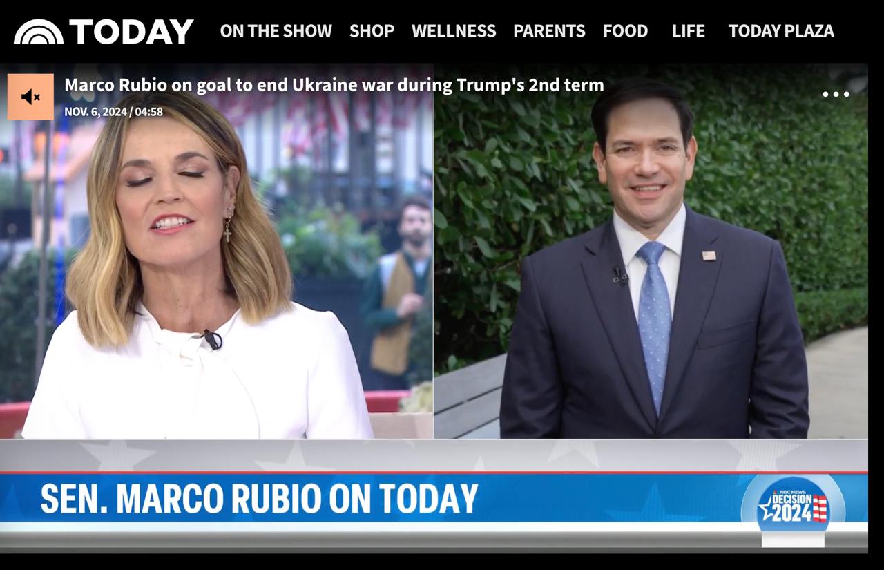 18.00 Война в Украине "зашла в тупик" и ее надо остановить, заявил видный республиканец, сенатор Марко Рубио (Флорида), которого СМИ называют кандидатом на должность госсекретаря при Трампе.