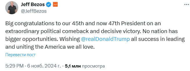 «Большие поздравления нашему 45-му и теперь 47-му президенту с выдающимся политическим возвращением и решительной победой. Ни у одной страны нет больших возможностей. Желаю Дональду Трампу всяческих успехов в руководстве и объединении Америки, которую мы все любим», – написал Безос в Х.