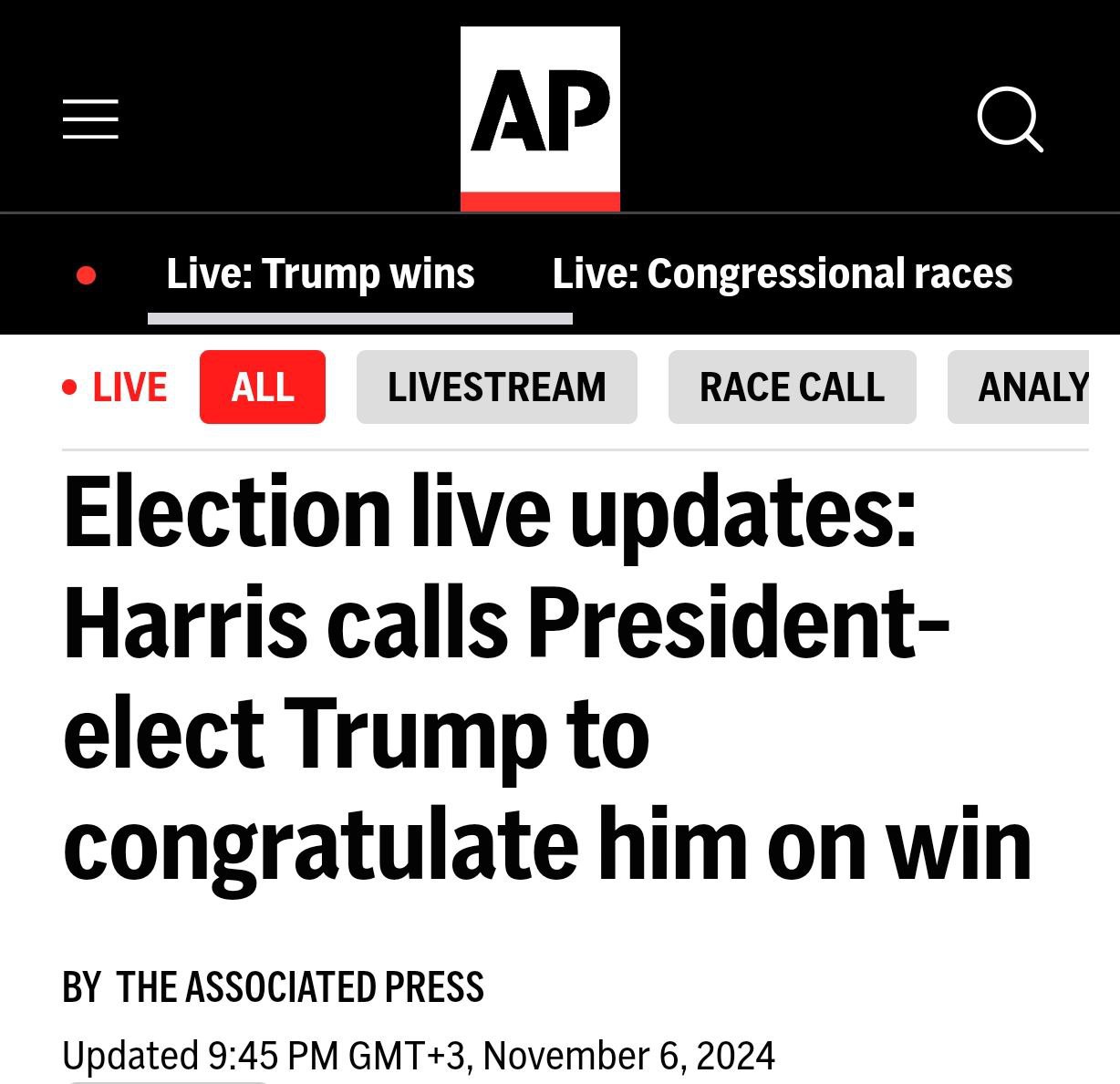 20.52 Харрис позвонила Трампу и поздравила его с победой, сообщает АР.