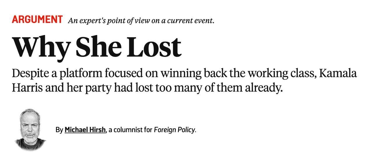 «На самом деле перед Харрис, возможно, стояла практически невыполнимая задача — попытаться преодолеть постоянно низкие рейтинги одобрения Байдена, когда около 2/3 или более избирателей считают, что нация идет по неверному пути», - пишет Хирш.