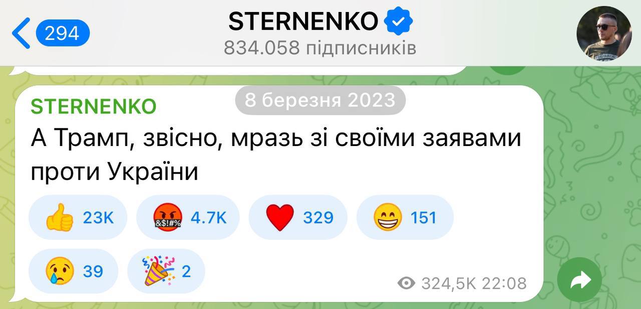 Расходится скрин с заявлением бывшего главы одесского "Правого сектора" Сергея Стерненко, который в 2023 году называл Трамп «мразью».