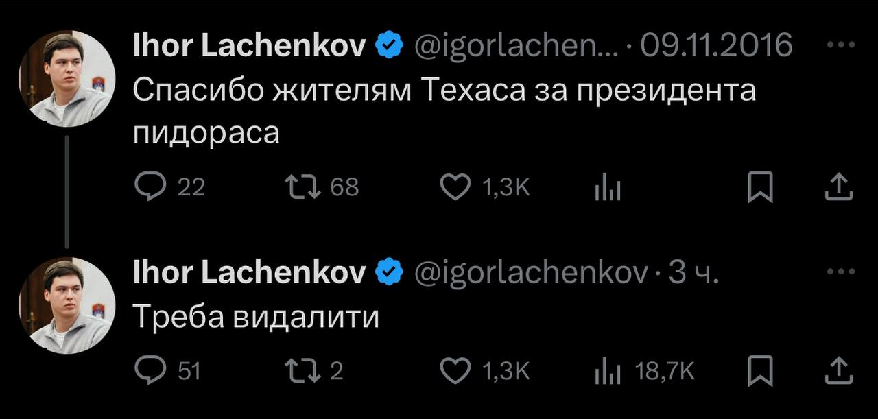 А Игорь Лаченков (администратор телеграм-канала «Лачен пише») в 2016 году называл Трампа «пи@орасом».