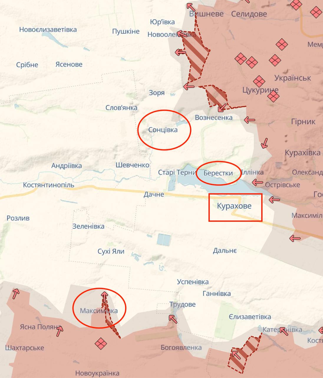 Южнее россияне уже зашли в Берестки, что на берегу Кураховского водохранилища, сообщает боец с позывным Мучной. Он считает, что вскоре начнутся бои восточнее, за Старые Терны.