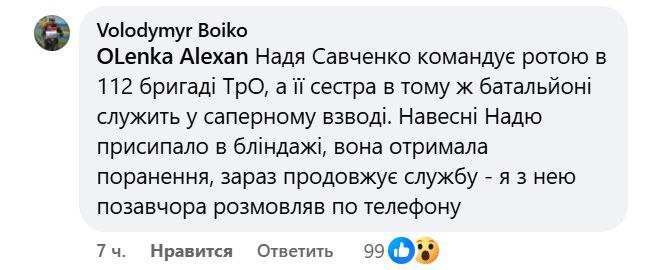 "Надя Савченко командует ротой в 112-й бригаде ТРО, а ее сестра в том же батальоне служит в саперном взводе. Весной Надю присыпало в блиндаже, она получила ранения, сейчас продолжает службу", – написал он в Фейсбуке.