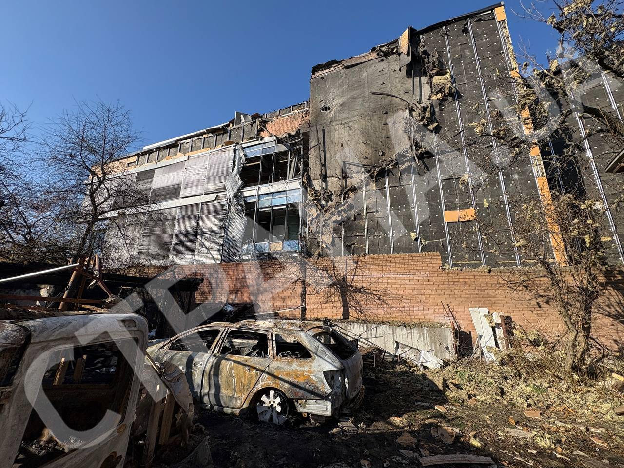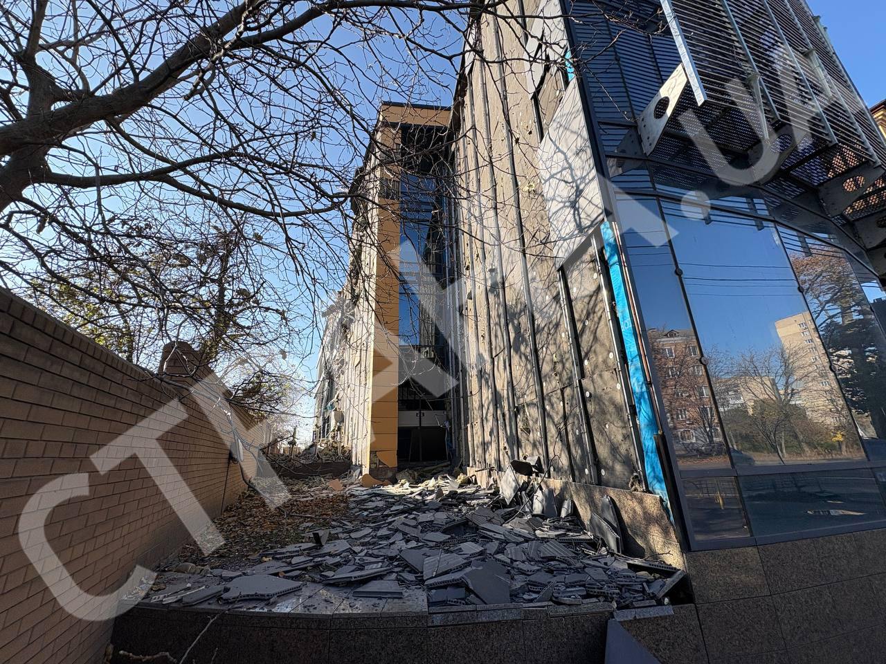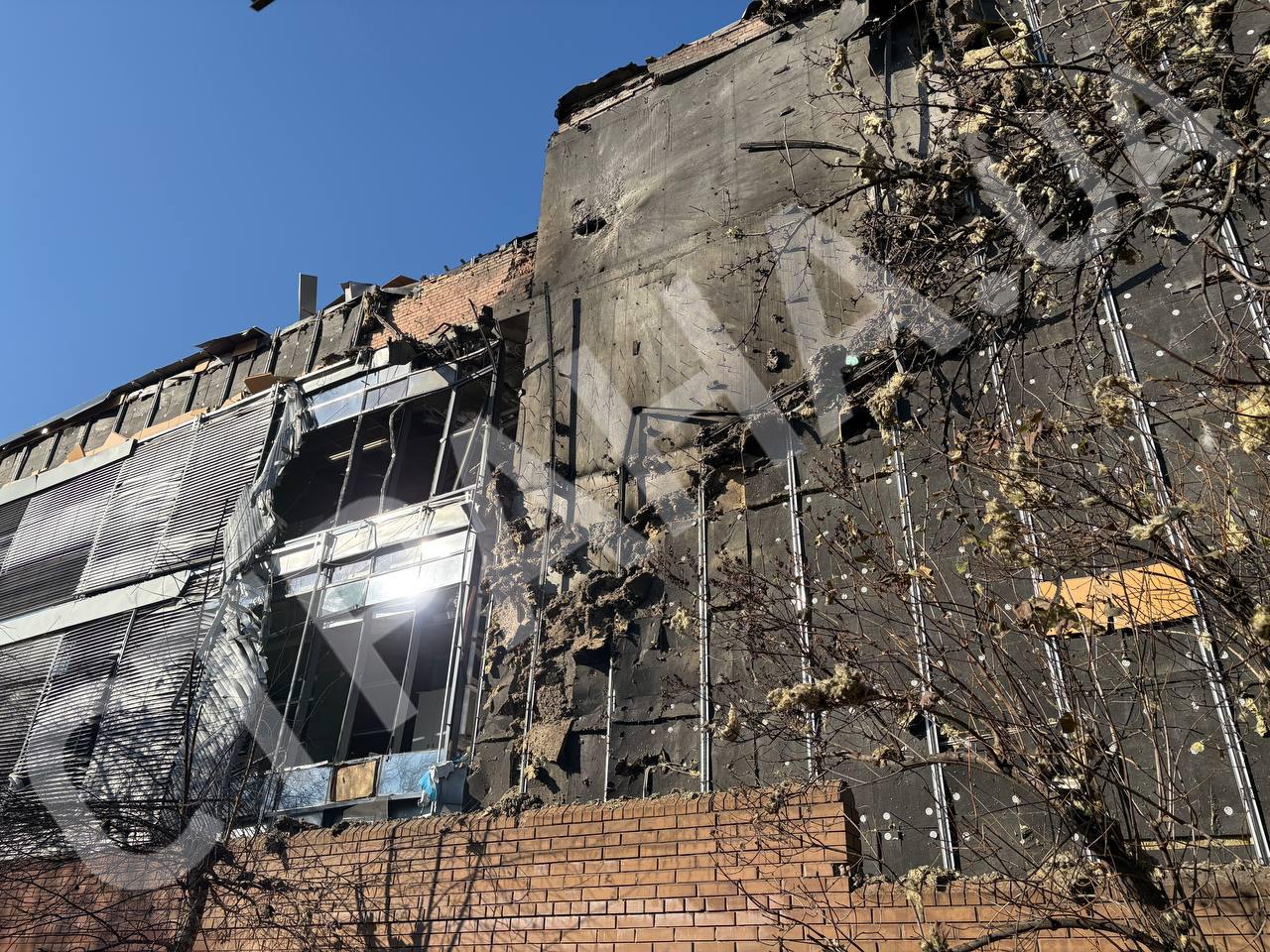 12:13 Последствия прилета "Шахеда" по зданию бизнес-центра в Соломенском районе Киева.