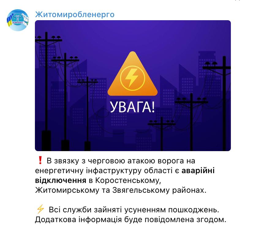 09:46 В ряде районов Житомирской области аварийные отключения света из-за прилетов по энергетике, сообщает облэнерго.