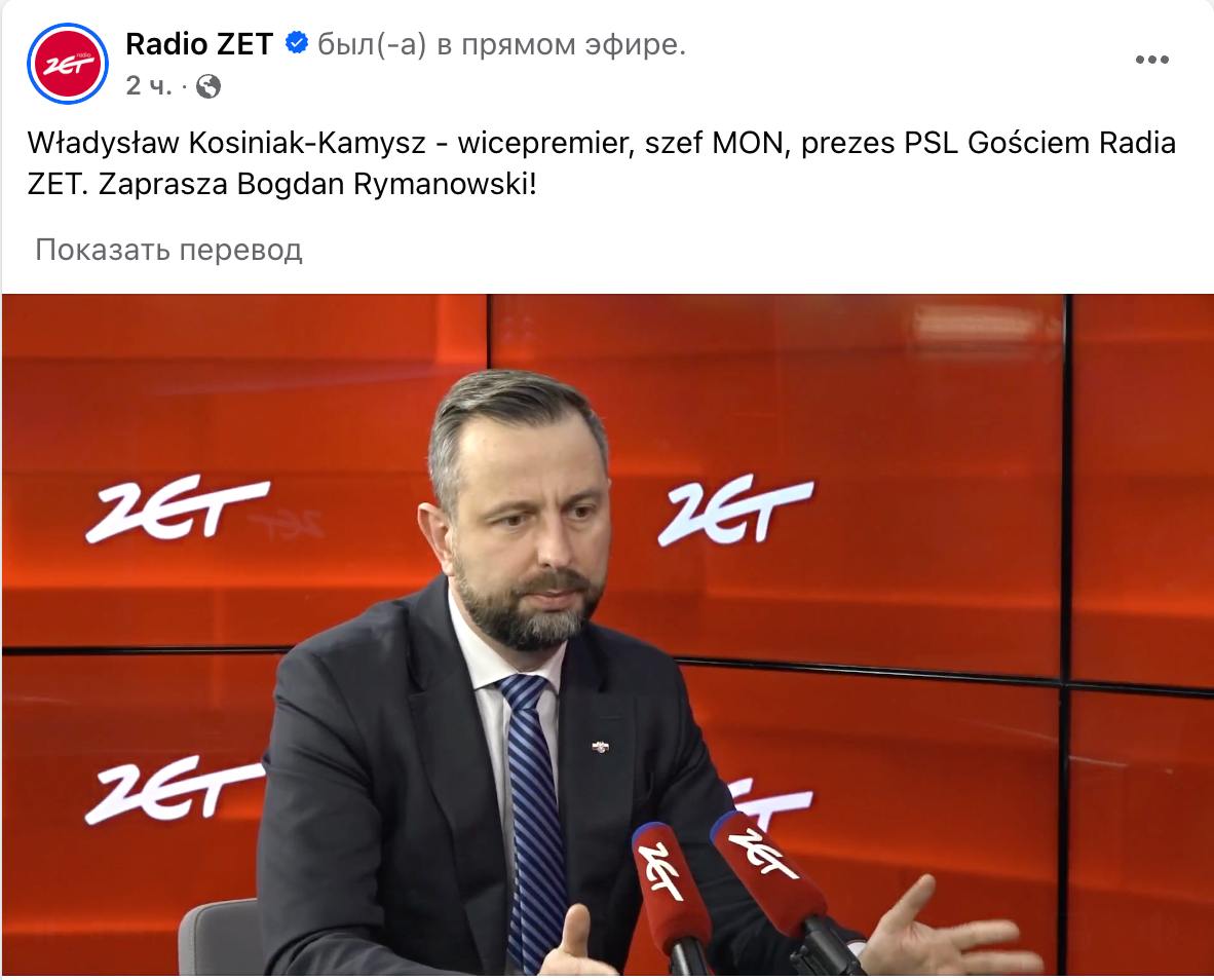 Такое заявление польский вице-премьер и министр обороны Владислав Косиняк-Камыш сделал в эфире Radio Zet.
