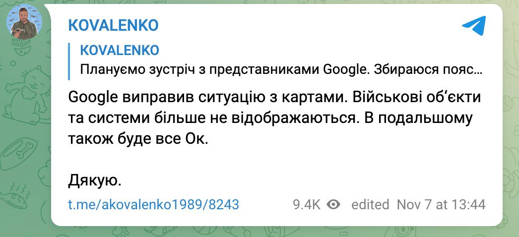3 ноября он сообщал, что Google обновил снимки на картах, "спалив" размещение украинских военных систем. Сразу был подан запрос, но Google не мог его исправить из-за выходных.